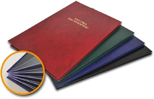 - teczki wykonane z tektury litej, pokrytej skóropodobnym tworzywem w kolorach: czarnym, bordowym, granatowym lub zielonym